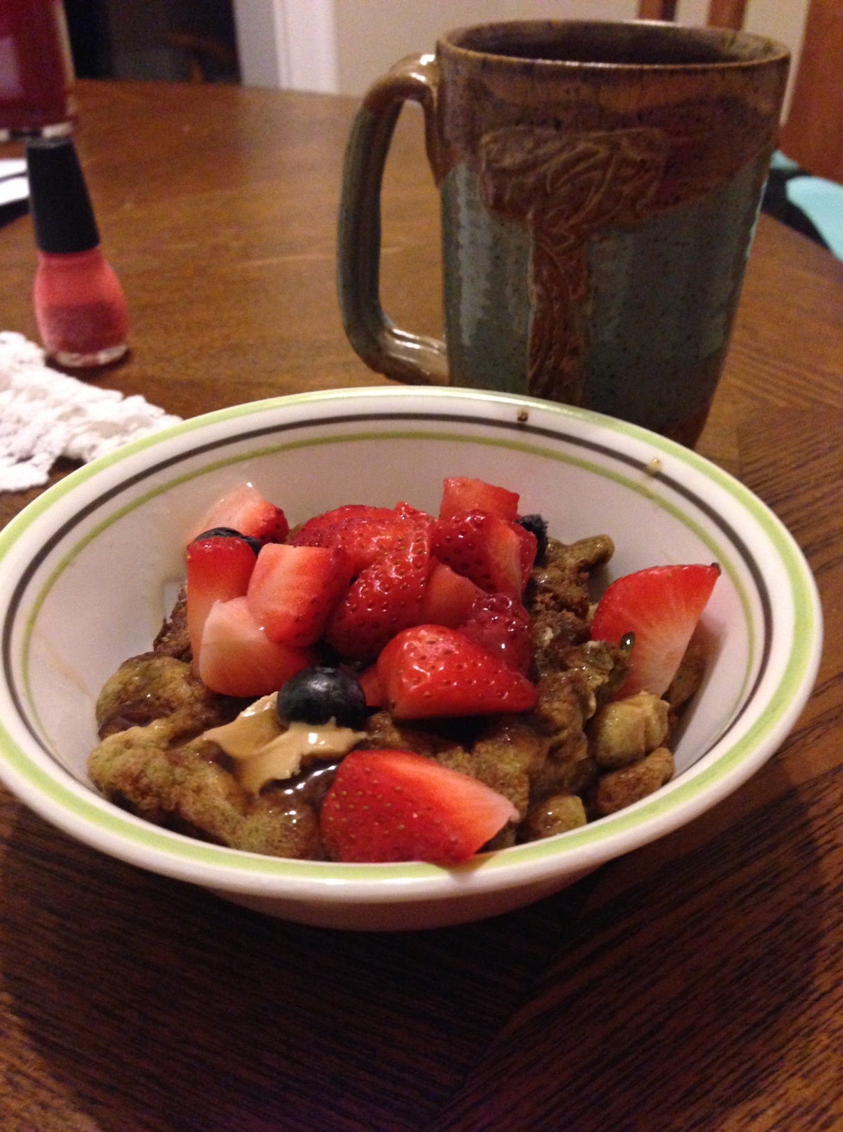 If you want to know how to make these super easy plantain waffles, let me know! I promise, it’s not even fair how easy it is, but I’m OK with that. I topped these bad boys with some strawberries, a dollop of cashew butter (which is my current favorite amongst nut butters), and walden farms pancake syrup. YUM YUM YUM.